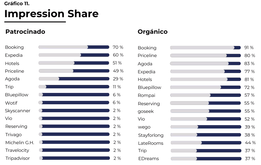 Aun así, es importante señalar que ambos grupos dominan ampliamente la cuota de impresiones tanto en enlaces orgánicos como en patrocinados, en especial Booking, tal y como se puede observar en el gráfico 11.